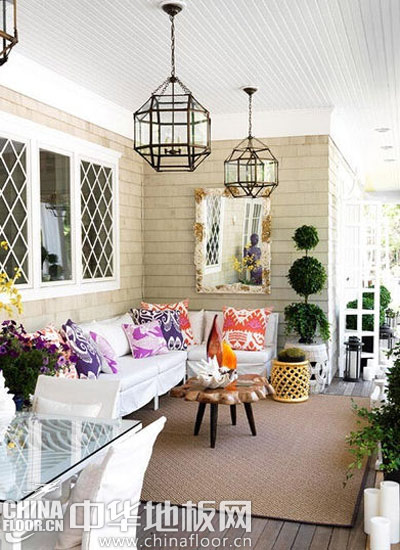 防腐木地板图片4:铁艺灯罩内点上蜡烛,它是夏日门廊聚会的好装饰。铁艺灯罩能很好地折射烛光制造浪漫氛围,还能很好地保护蜡烛不会被夏日的凉风吹熄。而防腐木地板则保证了空间的舒适度,也与周围的环境融合起来。
