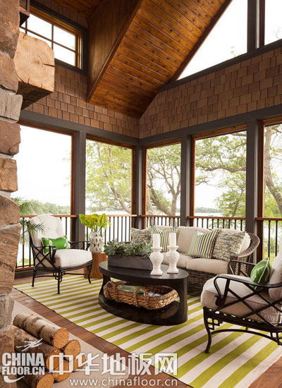 防腐木地板图片1:以木材打造的临海门廊,经过防腐处理的木地板更经久耐用。夏季天气炎热蚊虫也多,在别墅的门廊加个封闭的窗户,这样夏日的夜晚就能在门廊聊天或者倾听大自然的声音了。