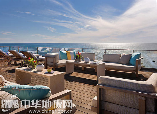 防腐木地板图片5:水天一色的壮观场景,当然不能错过。海边别墅的楼顶空间被巧妙运用,打造成一个露天的客厅,横向铺装防腐木地板,摆上柔软的沙发,坐在这里抬眼望去是广阔的海洋,从蔚蓝到碧绿,美丽而又壮观。