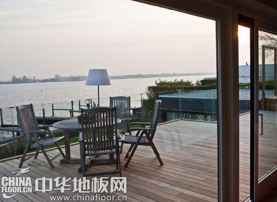 防腐木地板图片6:这款海边度假别墅的户外露台就铺设了防腐木地板,木质的户外桌椅与防腐木地板搭配,格调一致,且自然韵味十足,尽揽无限金光。白色的灯罩是空间一大亮点,富有质感。因为采用了木质地板,自然气息漫溢,与绵延的海边自然美景有机结合,呈现出舒适怡然度假氛围。户外平台的扶手采用全玻璃的,不仅打造出无障碍户外观景效果,还与整体自然保持一致性。